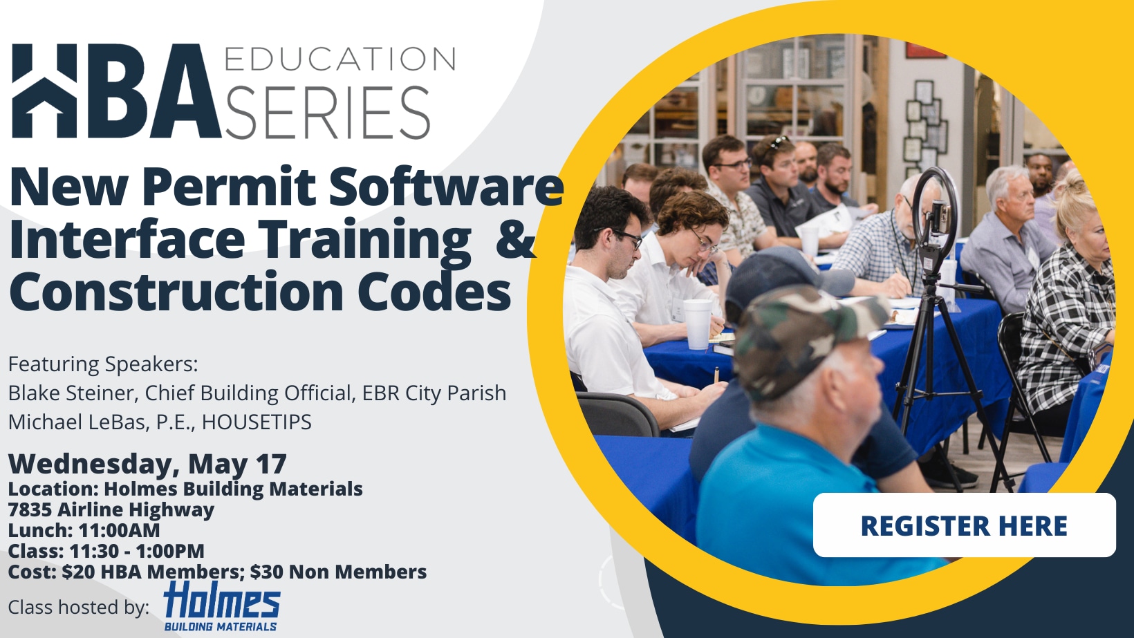 HBA Education Series featuring Michael LeBas, P.E. with HOUSETIPS, Bronze Industry Partner, and EBR City Parish Building Officials. Class hosted at Gold Industry Partner Holmes Building Materials.