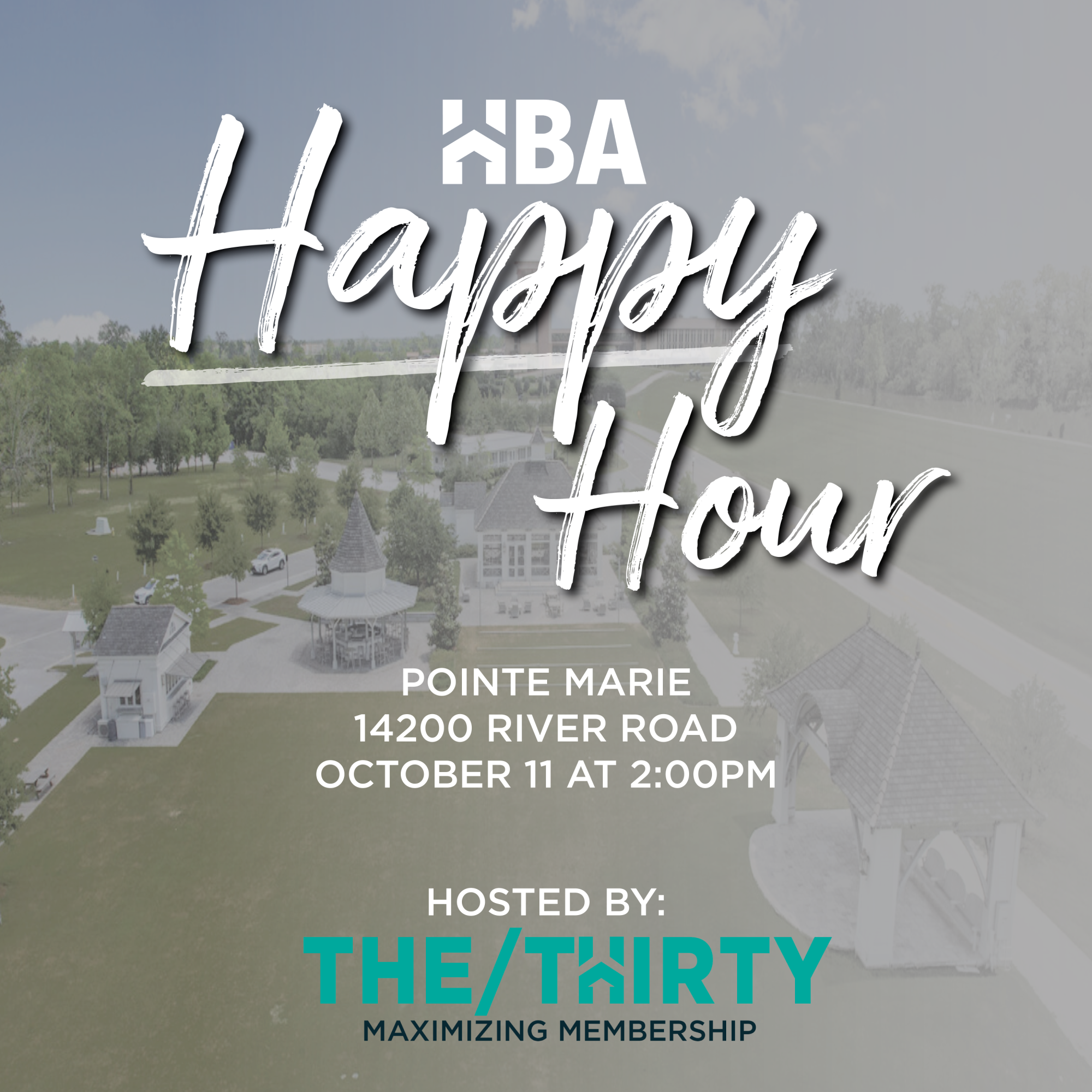 HBA Happy Hour will be held Wednesday, October 11th at 2:00 PM at Pointe-Marie. Happy Hour is open to all current HBA members and any future HBA members.