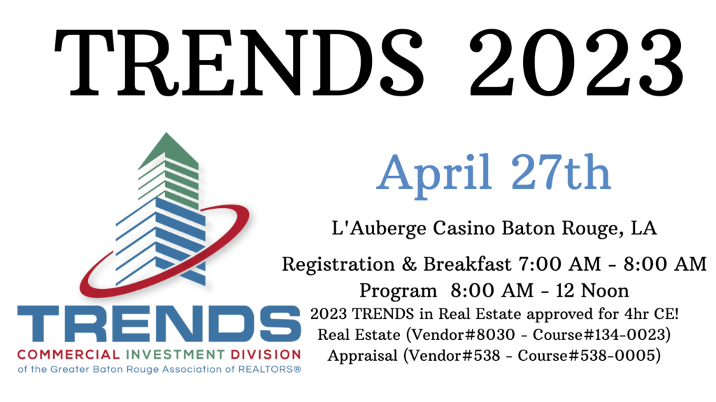 Drawing nearly 1000 professionals, including financial institutions, investors, property managers, developers and others associated with the residential and commercial real estate industry, gathered at Baton Rouge’s Preeminent Real Estate Event — the TRENDS Seminar. Join us this year for an examination of the state of the industry in our area and focus on emerging trends.