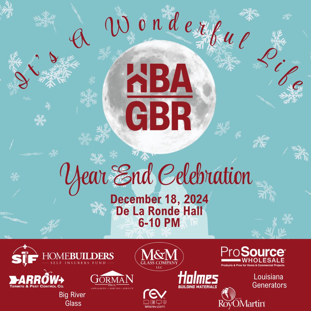 It's a wonderful life! Come celebrate the life and success of our members at the HBA I GBR Year End Celebration on December 18, from 6-10 p.m. at De La Ronde Hall in Downtown Baton Rouge. Arrive early and stay late for awards, cocktails, music, door prizes and more! Catering provided by Ruffino's.